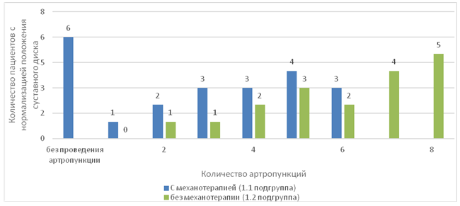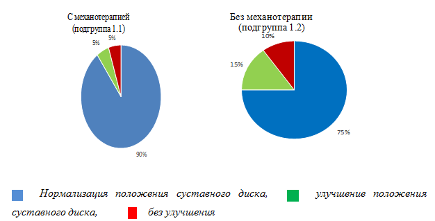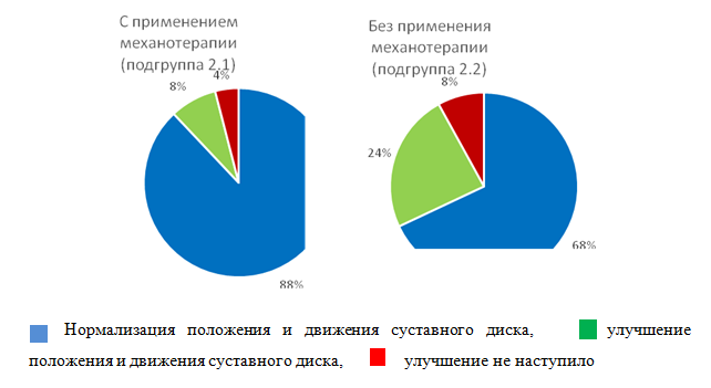 Согласно данным диаграммы, с применением механотерапии в сочетании с артропункцией нормализация положения суставного диска в подгруппе 1.1 достигнута у 90 % пациентов (18 человек), у 5 % пациентов (1 человек) наступило улучшение, а у 5 % пациентов (1 человек) положительная динамика не получена. В подгруппе 1.2 (без применения механотерапии) нормализация положения суставного диска достигнута у 75 % пациентов (15 человек), у 15 % пациентов (3 человека) наступило улучшение, а у 10 % пациентов (2 человека) положительная динамика не получена. Пациенты, у которых не получена положительная динамика, были отправлены на консультацию к челюстно-лицевому хирургу для решения вопроса о возможности проведения артроскопии ВНЧС и дальнейшего ортопедического лечения.