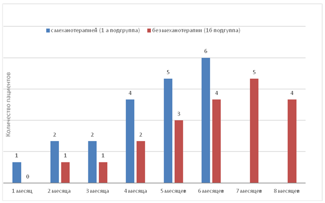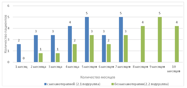 Из данных рисунка 5, у пациентов, которым проводилась механотерапия в сочетании с артроцентезом (подгруппа 2.1) время лечения составляло 1–7 месяцев, а у пациентов без проведения механотерапии (подгруппа 2.2) 2–10 месяцев.
