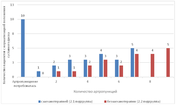 Показателем эффективности лечения пациентов с хроническим вывихом суставного диска, как и у пациентов с его подвывихом, может быть уменьшение количества артропункций, проведения которых потребовалось для нормализации положения и функции суставного диска. На рисунке 4 представлено количество артропункций у пациентов 2.1 и 2.2 подгрупп, проведения которых потребовалось для нормализации движения суставного диска.